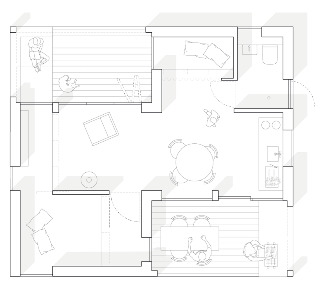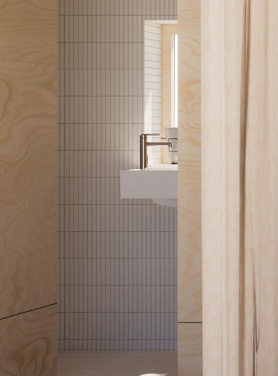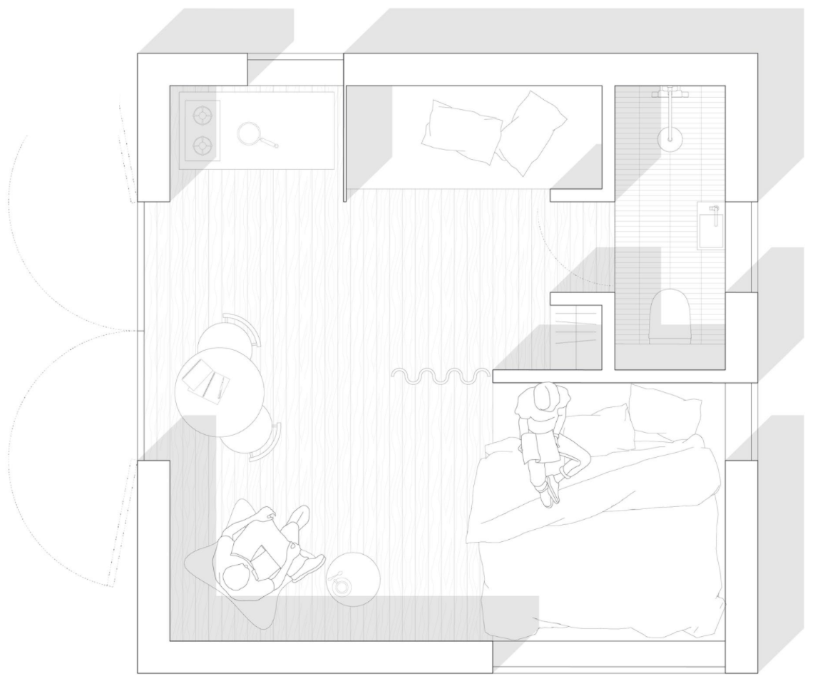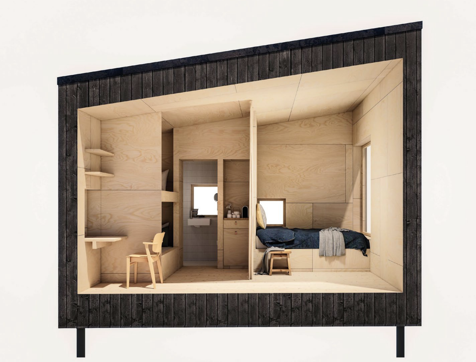 Modulet på 23 m² er lille, men rummer meget. Her kan du både sove, arbejde, trække dig tilbage – eller invitere nogen forbi. Den kvadratiske form giver en god rytme i rummet og en rolig arkitektonisk stemning, der passer naturligt ind i både fællesskabet og landskabet. Det spiller sammen med de andre enheder og får hele området til at hænge bedre sammen – både æstetisk og i praksis.